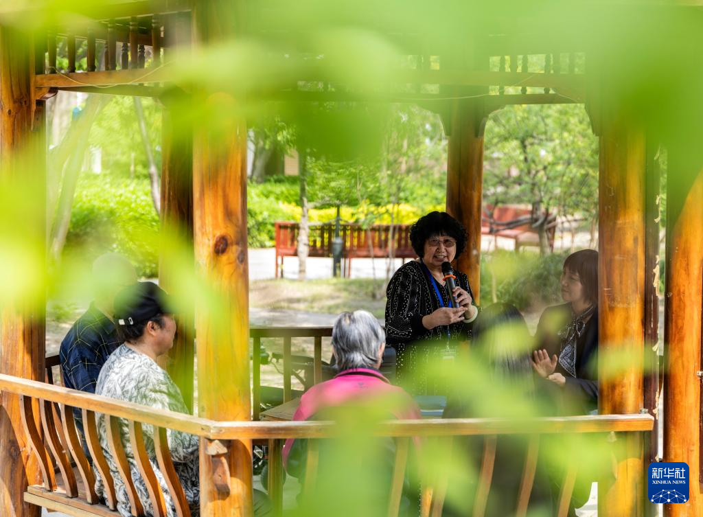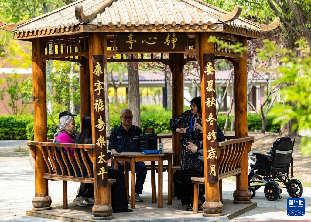 4月23日,在天津市滨海新区第一老年养护院,老人们围坐一起表演节目。