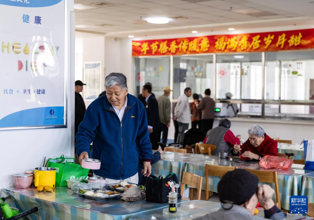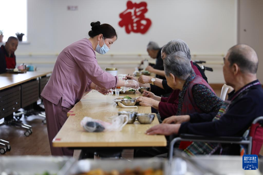 4月23日,在天津市滨海新区第一老年养护院,护理员为老人提供助餐服务。