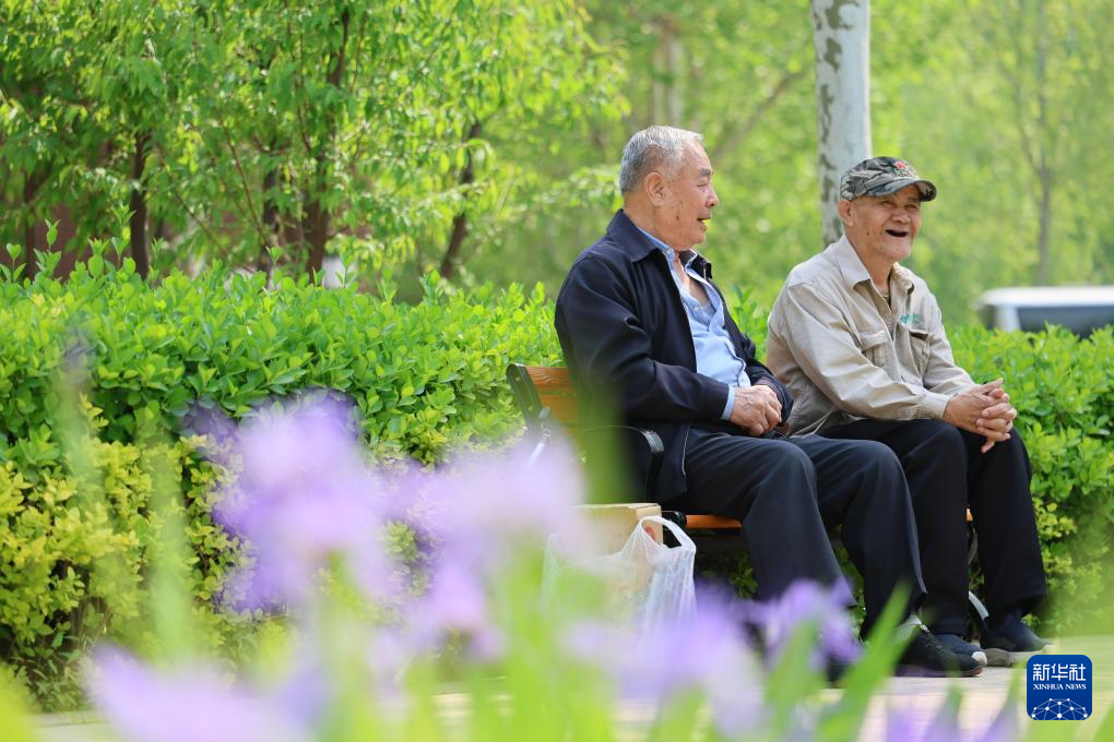 4月23日,在天津市滨海新区第一老年养护院,工作人员陪老人聊天。