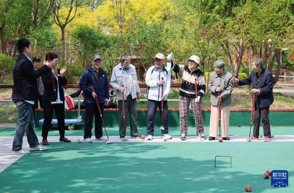 4月23日,老人在天津市滨海新区第一老年养护院内打门球。