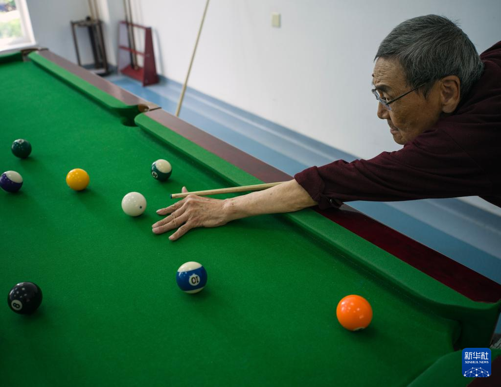4月23日,老人在天津市滨海新区第一老年养护院打台球。
