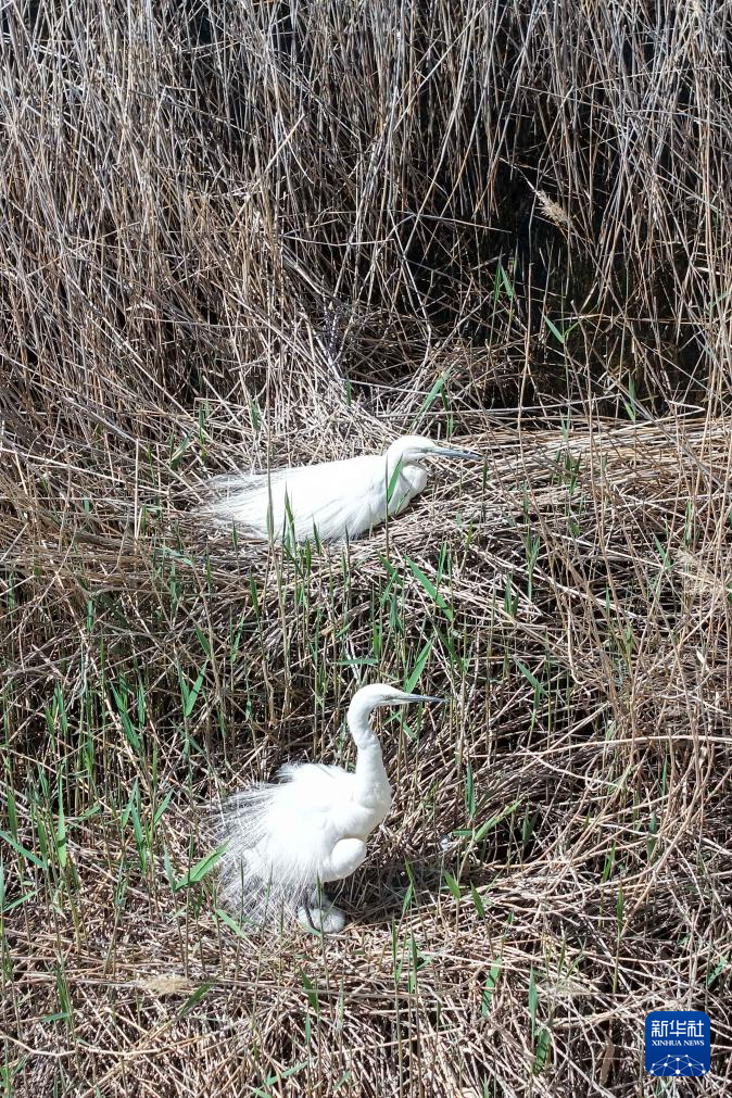 4月24日,大白鹭在青土湖的芦苇荡里筑巢育雏(无人机照片)。