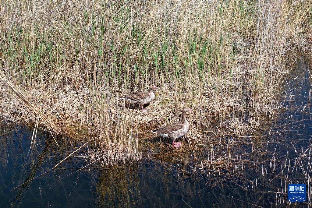 4月24日,灰雁在青土湖筑巢育雏(无人机照片)。
