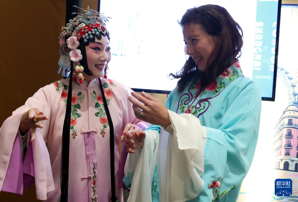 4月24日,在英国伦敦举行的“城市茶客厅”暨“魅力上海”城市形象推广活动上,一名女子与昆曲演员互动。