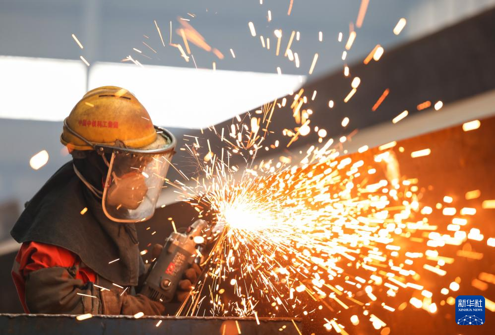 4月27日,在中铁科工集团武汉江夏制造基地,技术工人对钢结构配件进行打磨作业。