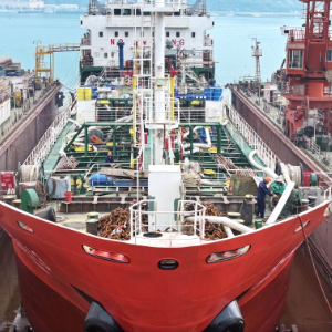 4月27日,在江苏省连云港鸿云实业有限公司生产基地,一艘船舶正在建设中(无人机照片)。