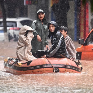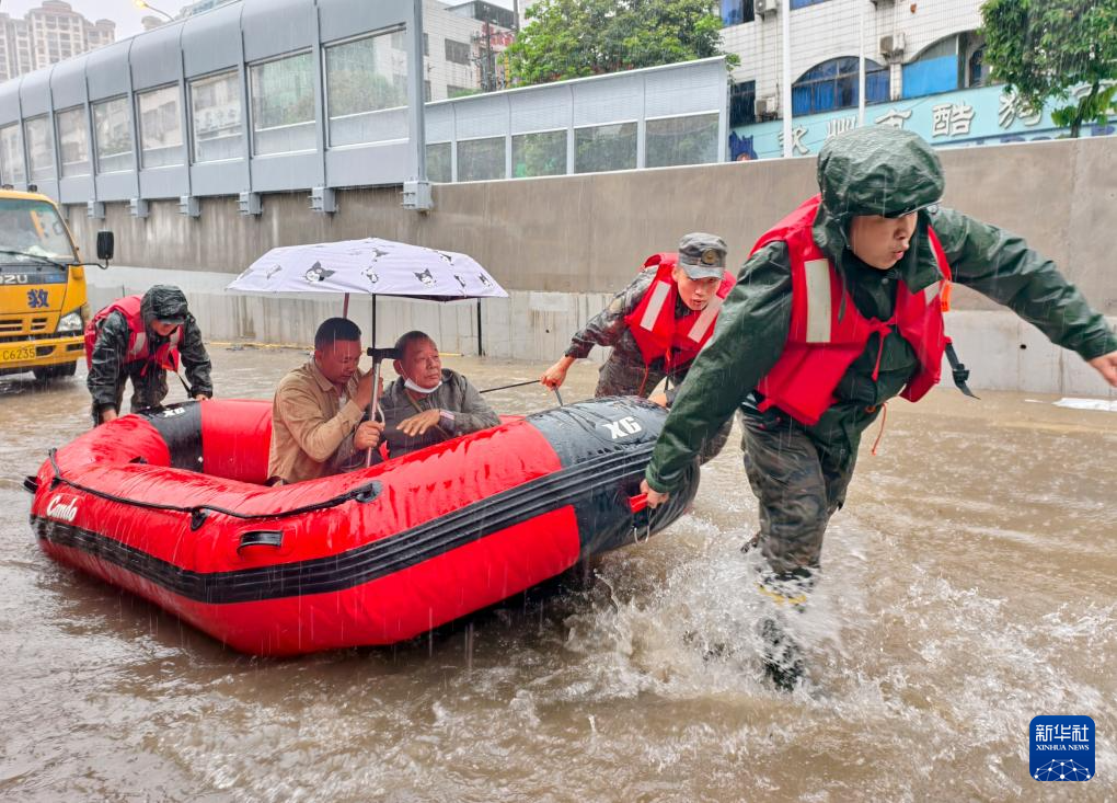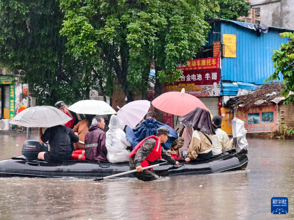 4月27日,武警官兵在钦州市新华路附近用冲锋舟将需要就医的群众送往附近的医院。
