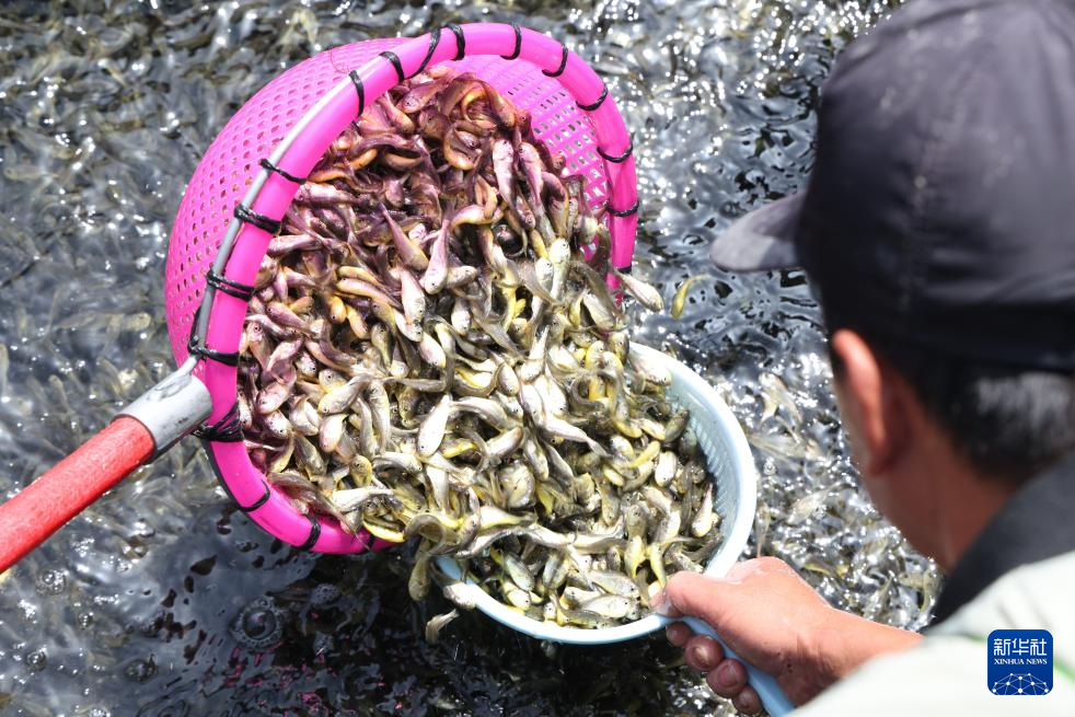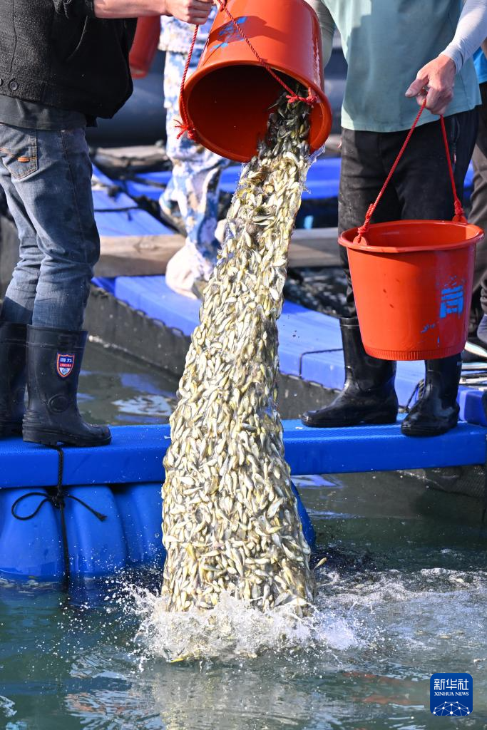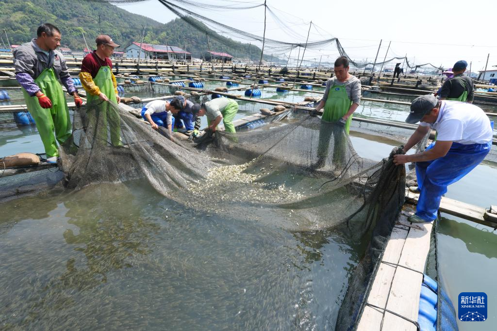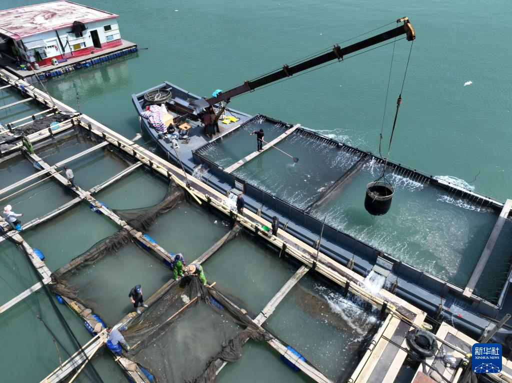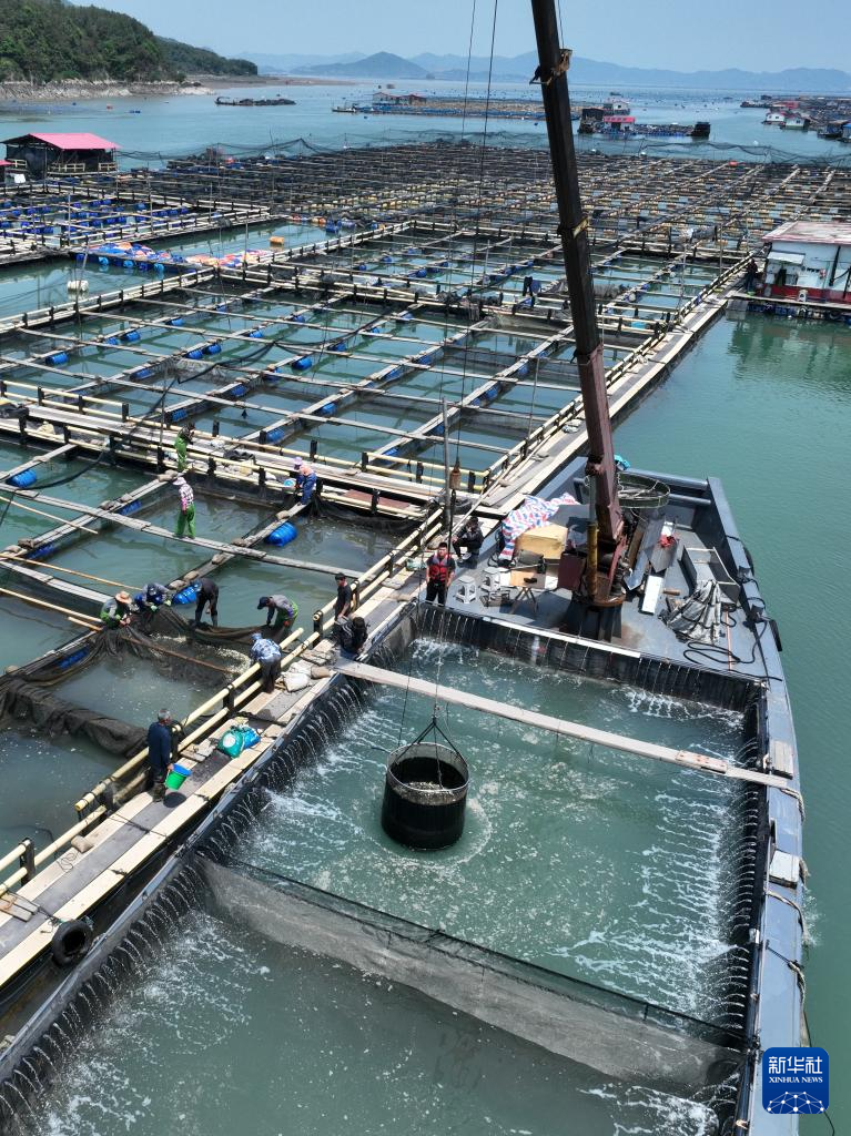 4月25日,在福建省宁德市霞浦县下浒镇海上养殖区,养殖户将大黄鱼鱼苗投放至渔排。