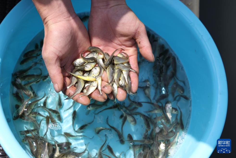 4月25日,在福建省宁德市三都澳海上养殖区,工人展示大黄鱼鱼苗。