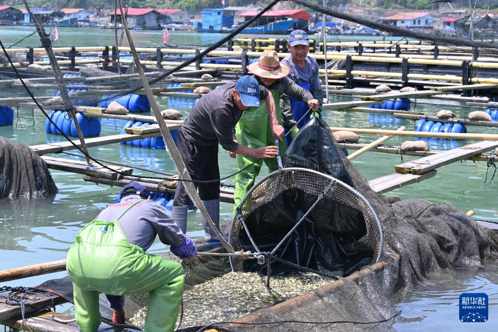 4月25日,在福建省宁德市三都澳海上养殖区,工人从育苗企业的养殖渔排收集大黄鱼鱼苗,准备通过活水船运往养殖户的渔排。