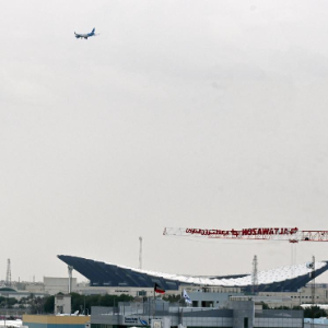 4月26日,在科威特费尔瓦尼耶省,一名男子向一架飞过科威特国际机场上空的客机挥舞科威特国旗。