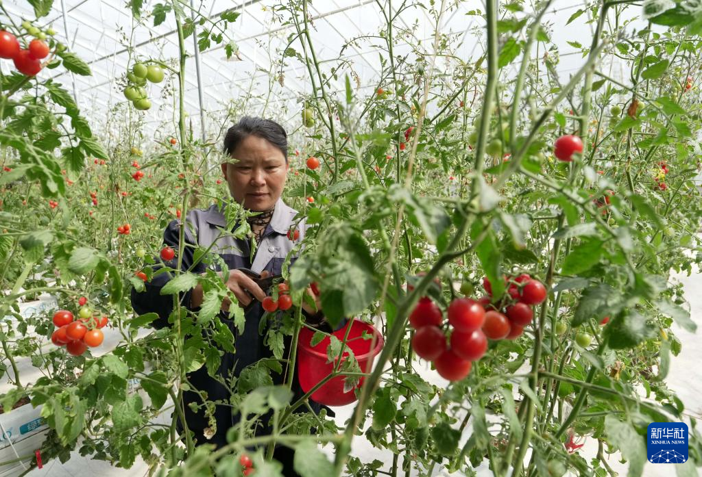 4月27日,农民在河北省卢龙县木井镇蔬菜种植基地的大棚内采摘西红柿。