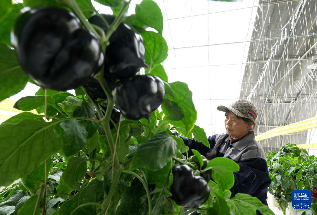 4月27日,农民在河北省卢龙县木井镇蔬菜种植基地的大棚内管护黑色辣椒。