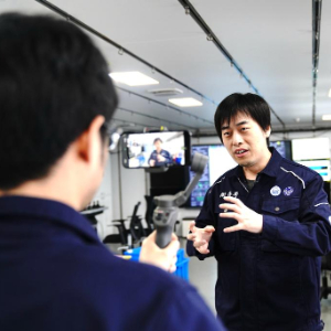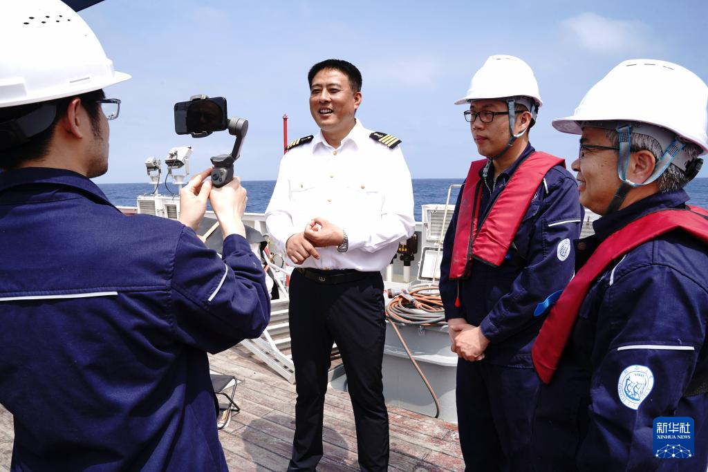 4月28日,“同济”号船长石斌(左二)在直播中回答问题。