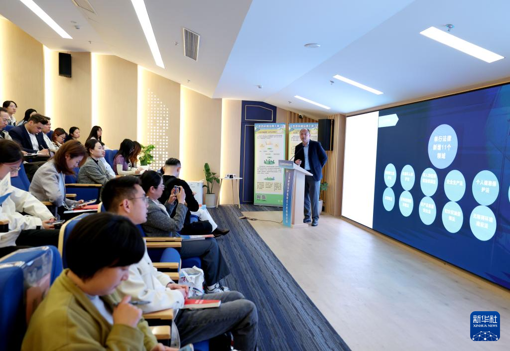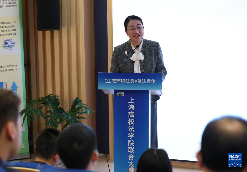 4月28日,位于上海市长宁区的全国人大常委会法工委虹桥街道基层立法联系点举行生态环境法典普法宣传暨上海高校法学院联合大思政课。这是上海铁路运输检察院检察官黄皓翔在活动中授课。