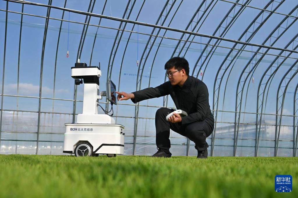 4月29日,在黑龙江北大荒农业股份有限公司八五九分公司的水稻育秧大棚里,技术人员对智能巡检机器人进行调试和操作。