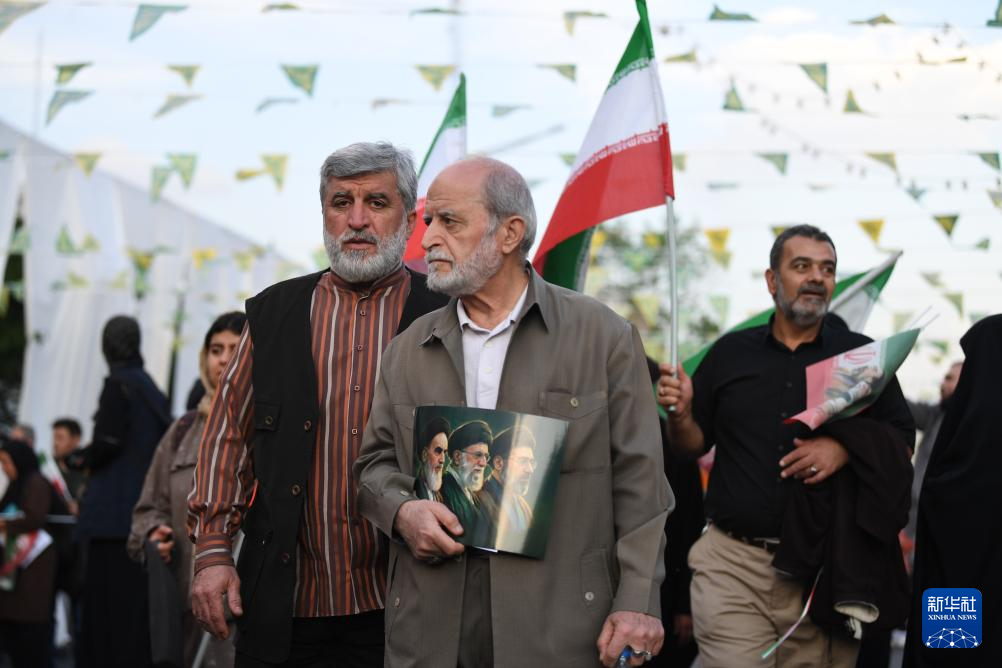 4月29日下午,伊朗首都德黑兰大批民众从城市不同方向走上街头参加游行集会,表达对伊朗最高领袖穆杰塔巴·哈梅内伊的忠诚,并展示国家团结。