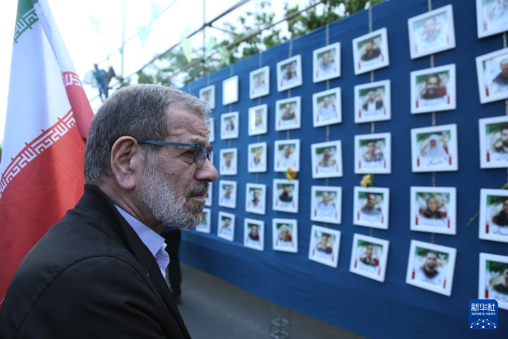 4月29日,在伊朗首都德黑兰,一名参加游行集会的男子在美以袭击遇难者遗像前驻足。