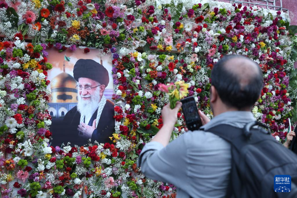 4月29日,在伊朗首都德黑兰,一名参加游行集会的男子拍摄伊朗已故最高领袖阿里·哈梅内伊的照片。