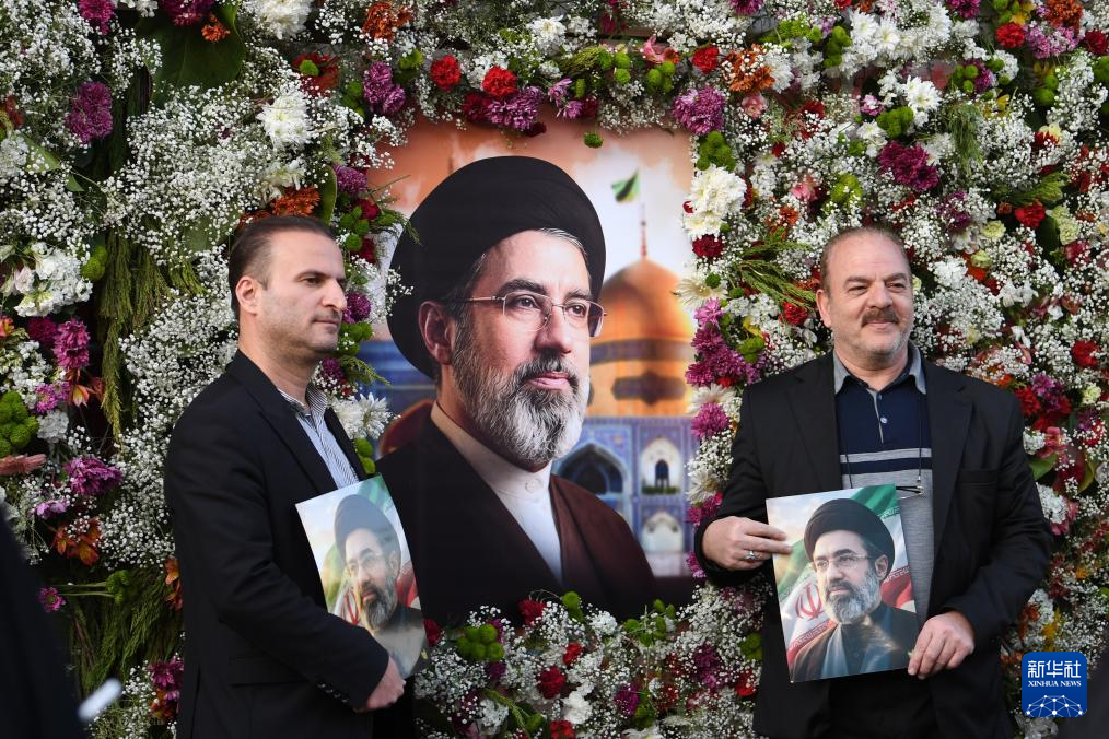 4月29日,在伊朗首都德黑兰,一名男子手持伊朗已故最高领袖霍梅尼、阿里·哈梅内伊和和现任最高领袖穆杰塔巴·哈梅内伊的画像参加游行集会。