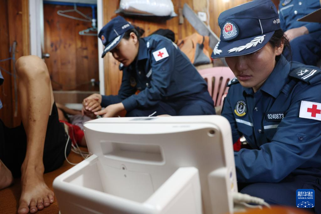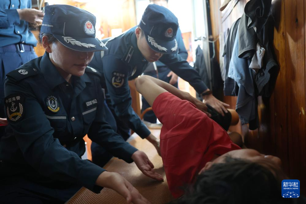 海警川山舰随舰医生李宜佳(左)和同事在渔船上帮助患病渔民翻身做检查(4月26日摄)。