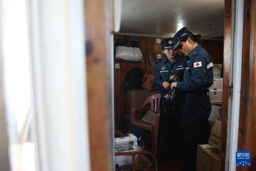 海警川山舰随舰医生李宜佳(左)和卫生员单荣荣在医务室整理急救药品,准备前往渔船救治患病渔民(4月26日摄)。新华社记者 陈斌 摄pagebreak