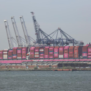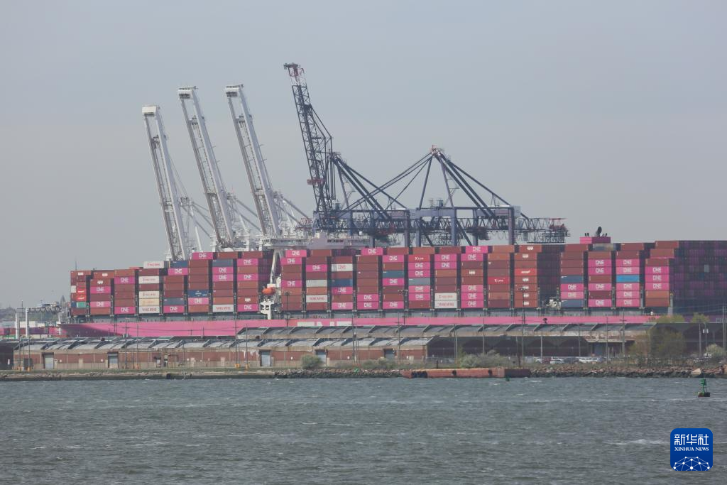 4月29日,一艘集装箱船离开美国纽约和新泽西港。