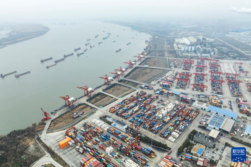 “华航新能1”轮在武汉阳逻港水域靠近停泊(1月29日摄,无人机照片)。