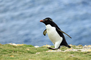 这是12月19日在马尔维纳斯群岛(英称福克兰群岛)海豹湾拍摄的一只跳岩企鹅。