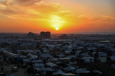 2025年12月31日傍晚,在加沙地带南部城市汗尤尼斯,落日余晖洒落在流离失所的巴勒斯坦人栖身的帐篷区。