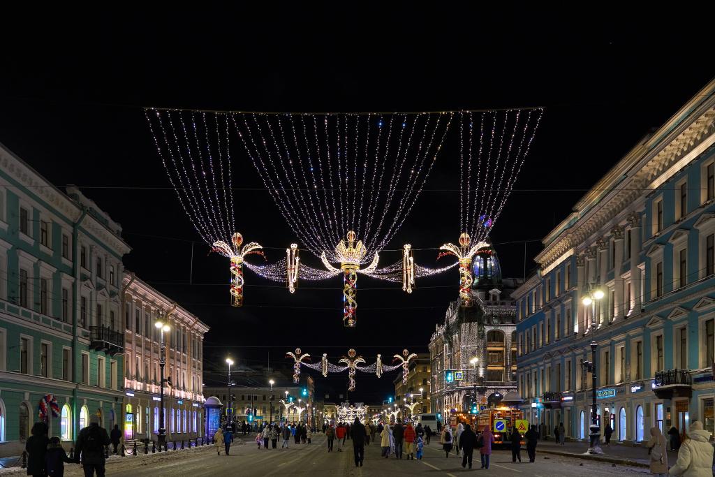2025年12月31日,俄罗斯圣彼得堡的涅瓦大街点亮灯饰,庆祝新年的到来。