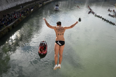 1月1日,人们在荷兰布卢门达尔参加冬泳活动时自拍。