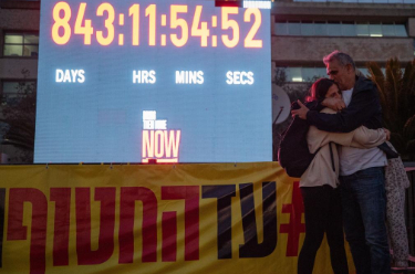 1月27日,在以色列特拉维夫一处广场,人们参加计时牌关闭活动时拥抱。