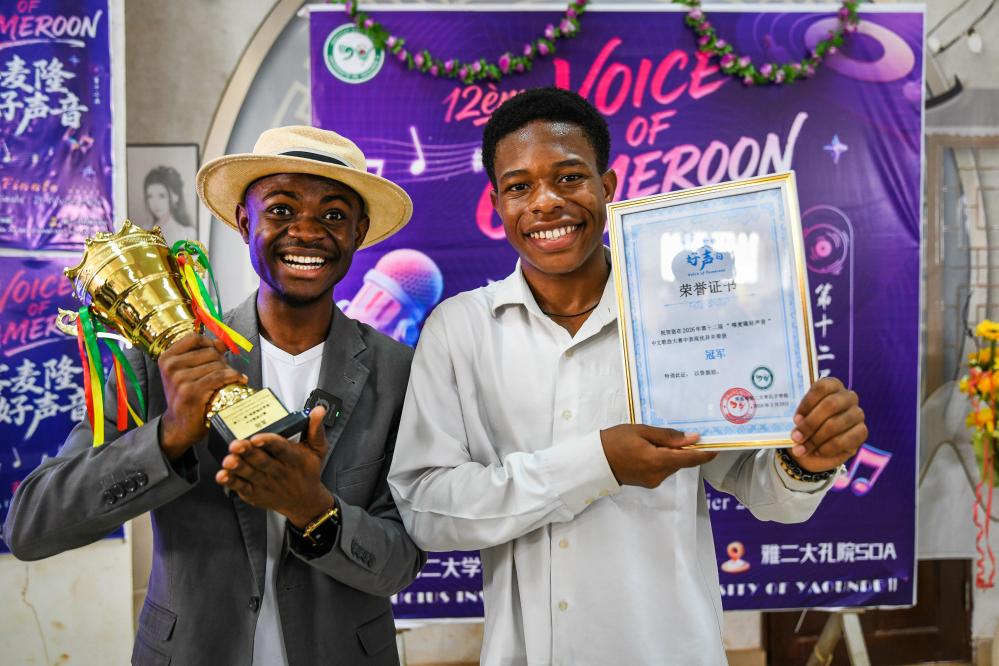 2月20日,在喀麦隆索阿,获得第12届“喀麦隆好声音”中文歌曲大赛冠军的选手展示奖杯和证书。