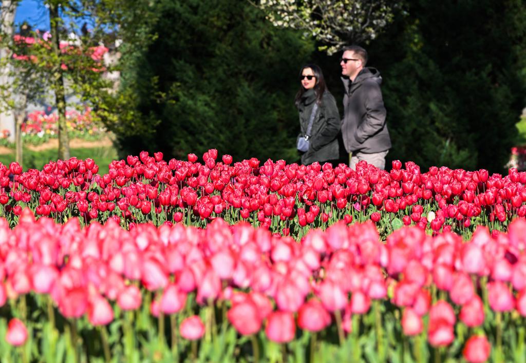 4月11日,在土耳其伊斯坦布尔,游客来到埃米尔安公园赏花休闲。
