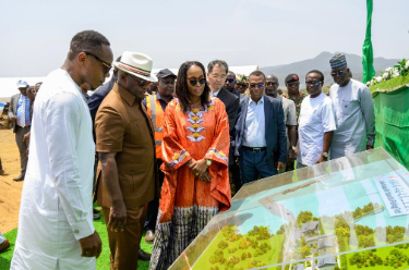 4月23日,在塞拉利昂西部地区布莱克·约翰逊村,塞拉利昂总统比奥(左二)在中国援建的塞拉利昂渔码头项目海上工程启动仪式上参观项目沙盘模型。