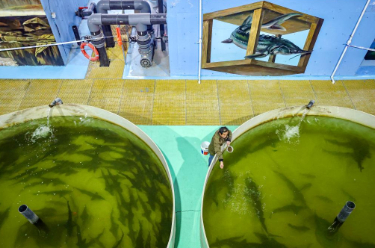 12月12日,在位于宁夏贺兰县的银川科海生物技术有限公司工厂化养殖车间内,工作人员为鲟鱼投食。