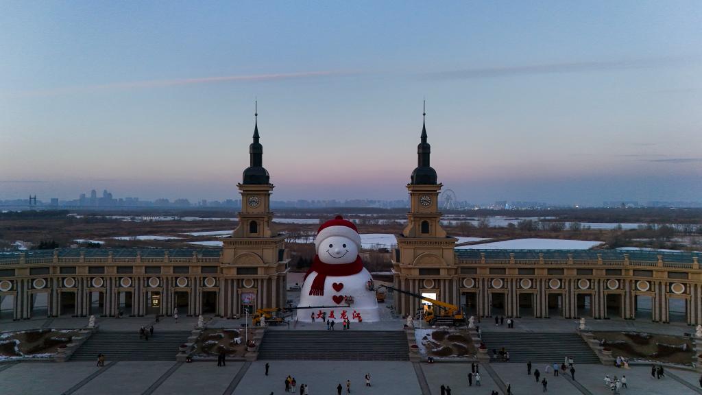 12月14日,正在建设中的哈尔滨群力音乐公园网红大雪人头部已完成,露出憨态可掬的笑容。