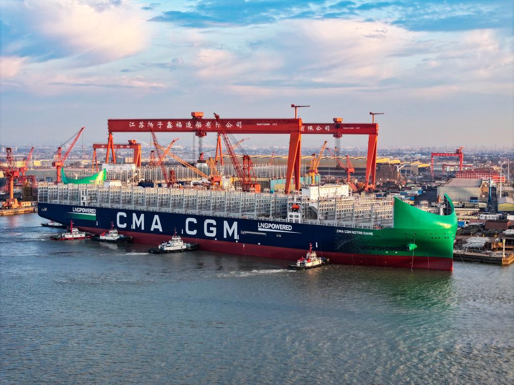 12月27日,在泰州海事部门的全力护航下,超大型双燃料集装箱船“鑫福136”轮顺利从江苏泰州泰兴市的江苏扬子鑫福造船有限公司舾装码头安全离泊,前往太仓。