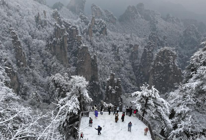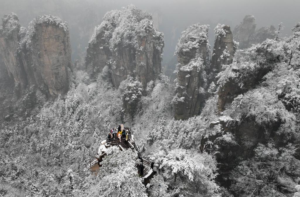 元旦假期第二天,许多游客来到湖南张家界国家森林公园登高观景、望山赏雪。