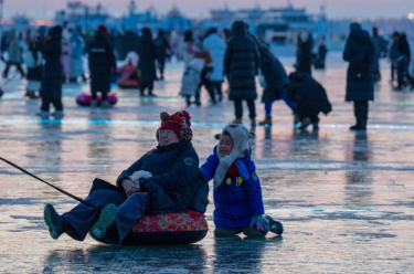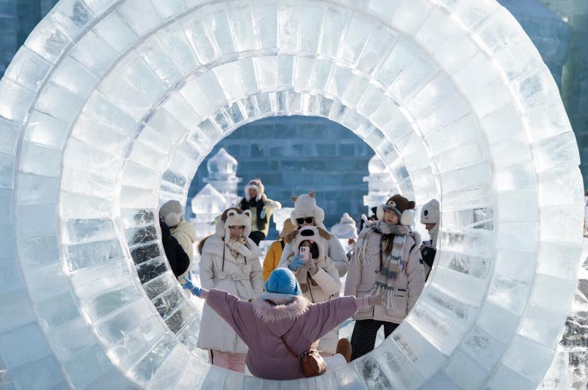 元旦假期,市民和游客来到第八届哈尔滨松花江冰雪嘉年华园区,体验冰雪娱乐项目,乐享假期。