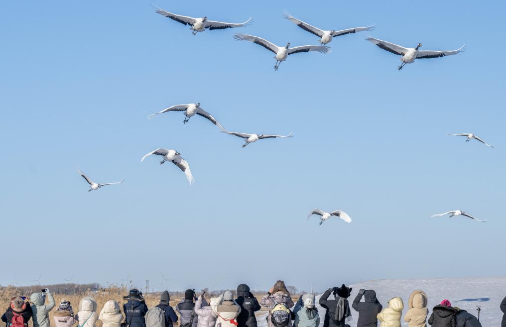 时值深冬,位于黑龙江省齐齐哈尔市的黑龙江扎龙国家级自然保护区银装素裹,冰雪中起舞飞翔的丹顶鹤吸引游客前来参观、拍照。