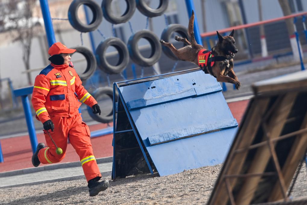 1月22日,在新疆乌鲁木齐消防救援机动支队库尔勒大队,消防员对搜救犬进行跃障训练。