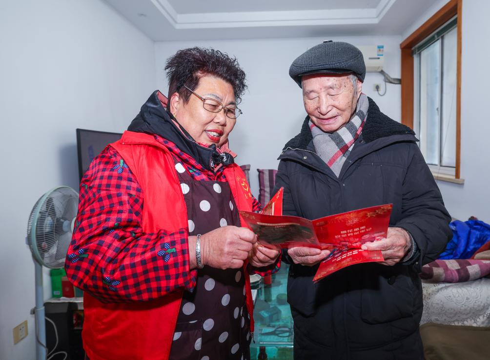 1月23日,在诸暨市陶朱街道友谊社区鸿远小区,楼道长(左)上门给高龄老人普及日常安全知识。