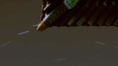 1月24日在北京使用智能天文望远镜拍摄的中国空间站从故宫上空飞过的轨迹(画面中部横线)。