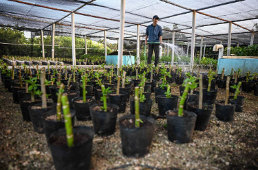 3月19日,在海南三沙赵述岛苗圃,工作人员为培育的苗木浇水。