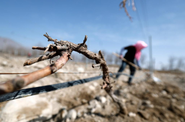 随着气温回暖,在宁夏贺兰山东麓的优质酿酒葡萄产区,数十万亩酿酒葡萄结束“冬眠”,迎来春季展藤。