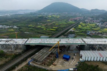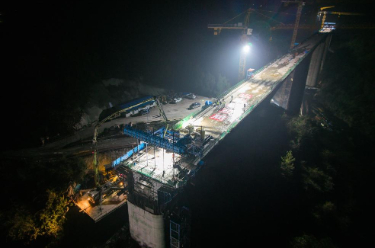 3月26日凌晨,在邵永高铁龙井头特大桥建设工地,中铁五局工人在进行连续梁合龙施工。