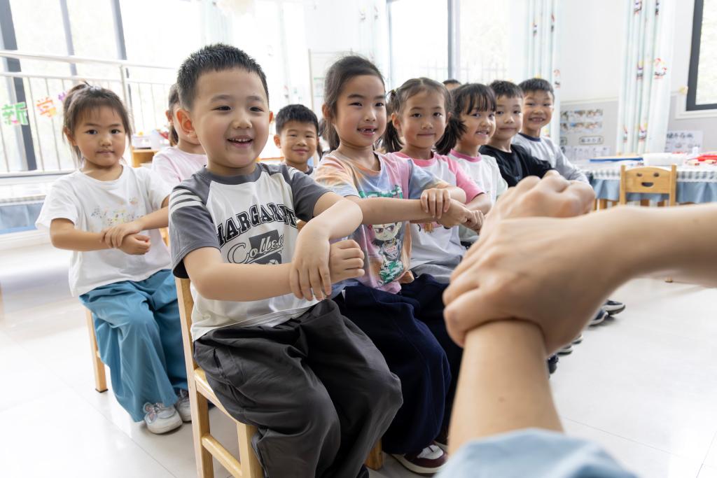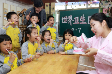 4月7日,湖北省武汉市江岸区快乐天使幼儿园老师为小朋友们示范正确的刷牙方式。