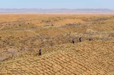 近日,宁夏中卫市组织治沙工人开展春季宁夏境内腾格里沙漠固沙锁边带改造提升工作,铺设新式草方格沙障,不断巩固治沙成果,筑牢黄河上游生态屏障。